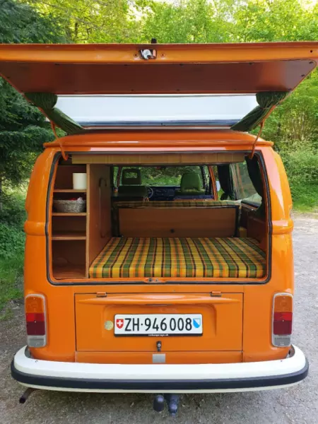 Das ist Lotta… eine gutmütige, entschleunigende, aufsehenerregende ältere Dame mit Original Westfalia-Ausbau. Willst du möglichst schnell von A nach B kommen und in kurzer Zeit so viele Pässe wie möglich überwinden? Dann ist Lotta die falsche Reisebegleiterin für dich. Wir investieren viel Zeit und Liebe in Lotta und verbessern, verschönern und optimieren laufend, vor allem die Inneneinrichtung, erhalten jedoch den Charme vom Originalausbau. Auch nach über 15 Jahren Campingbüsli-Erfahrung gibt es immer wieder Sachen zu optimieren und neue Ideen, wie etwas noch praktischer gemacht werden kann. Aussen und zum Teil auch Innen sieht man ihr ihr Alter natürlich auch an. Sie ist in einem sehr guten Zustand und wird jährlich von unserem Garagisten des Vertrauens auf Herz und Nieren geprüft. Mit Lotta könnt ihr max. 90km/h fahren. Steilere Strassen meistert sie mit ca. 30km/h, dafür hat man genügend Zeit die vorbeiziehende schöne Landschaft zu geniessen 😊 Die Tankanzeige ist momentan defekt. Wir haben aber eine gute «Strategie» herausgefunden, dass man sicher nicht mit leerem Tank irgendwo stehen bleibt 😉 Da Lotta Handgeschalten ist und keine Servolenkung hat, werden wir bei der Übergabe eine ausführliche Einführung inkl. Probefahrt machen. Lotta ist vollumfänglich ausgestattet mit Geschirr, Pfannen, Schüsseln, Besteck und Racletteöfeli (mit Kerzli betrieben). Der Kühlschrank kann nur mit Strom (220V) bzw. auch während der Fahrt (12V) betrieben werden; Gasbetrieb funktioniert nicht. Auf was ihr euch sonst noch freuen könnt: - 4 Schlafmöglichkeiten: 2 auf der ausgezogenen Sitzbank (B: ca. 110cm, L: ca. 182cm), 2 oben im Dach (B: 115 cm, L: ca. 182cm) - Sicherheitsgurten auf der Rückbank für zwei Personen - Abwaschutensilien (Schwamm, Bürsteli, Mittel, Abtrocktücher) sowie Fixleintücher geben wir mit - Outdoortisch inkl. Stühle sowie einen Sonnenschirm - Spülbecken mit Frischwasser- und Abwassertank (16L) - Gaskocher (2 Platten) im Büssli eingebaut - Basis-Gewürzauswahl - Kleines überschaubares Schränkli für Kleider - Klimaanlage = Fenster runterkurbeln 😉 - Keile, Kabelrolle 25m - Ulkiges Autoradio – holt eure verstaubten Kassetten wieder hervor :-D (kein CD-Player vorhanden) - DAB+ Radioempfang via Adapter - Schweizer Strassenkarte (ja, in Papierform 😊), mit Googlemaps kommt man ja sonst auch überall hin Die Übergabe findet grundsätzlich an unserem Wohnort statt. Je nach dem können wir jedoch auch einen anderen Ort vereinbaren.