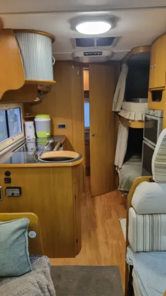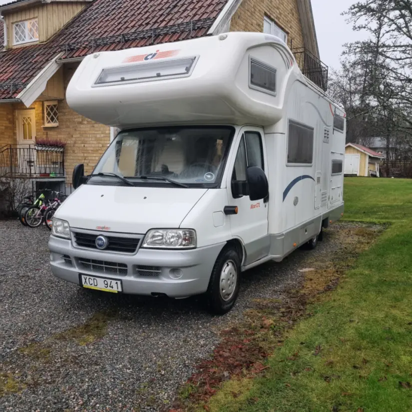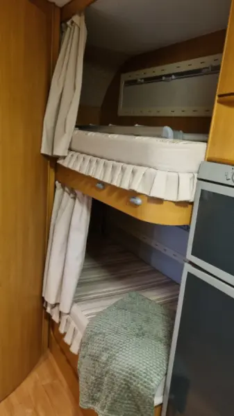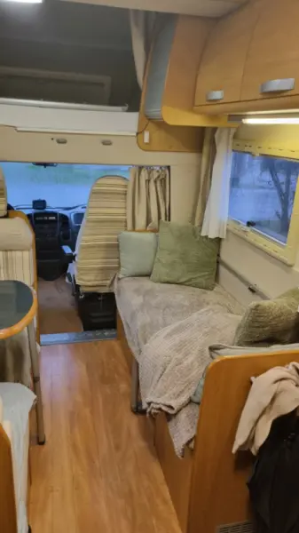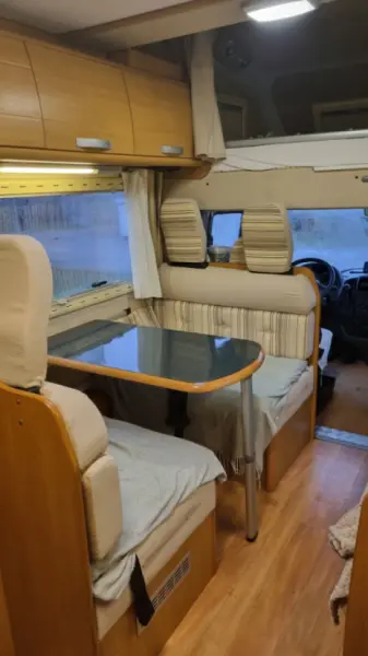 Mit Google-Übersetzer übersetzenUppvärmning på diesel. Stor alkov, våningssäng, nedbäddbar sittgrupp (2 sovplatser) 1 nedbäddbar enkel sittgrupp passande barn. På grund av all utrustning är det lite lastvikt. Tänk på att kanske fylla vattentank när man är på plats. Och inte packa mer än nödvändigt. "Soffan " är även en sittgrupp med bord där två stycken kan sitta.