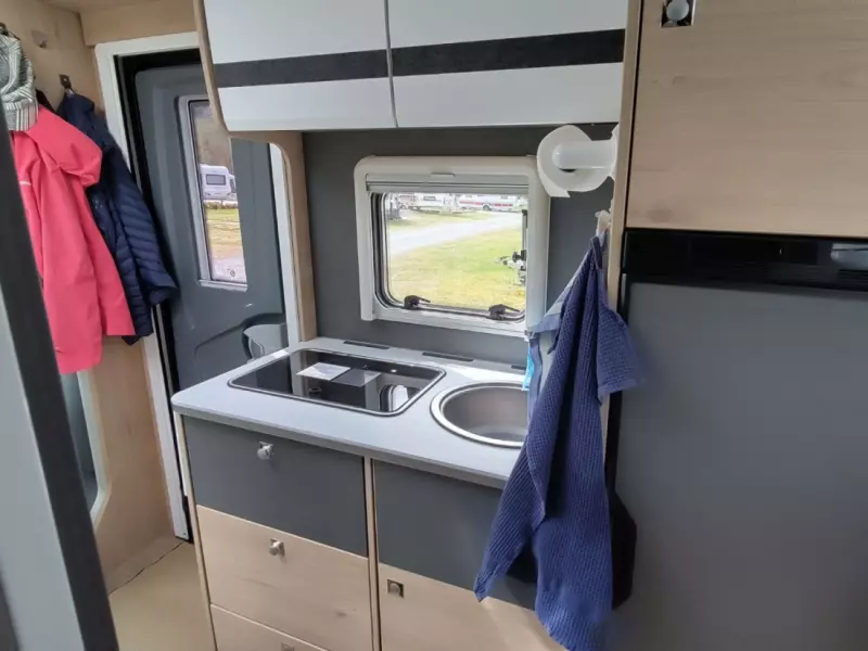 Eine Küche, in der das Wesentliche enthalten ist, was es für einen Campingreise braucht.