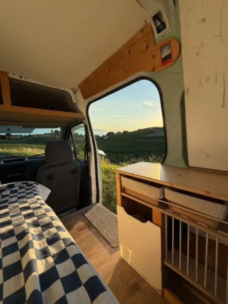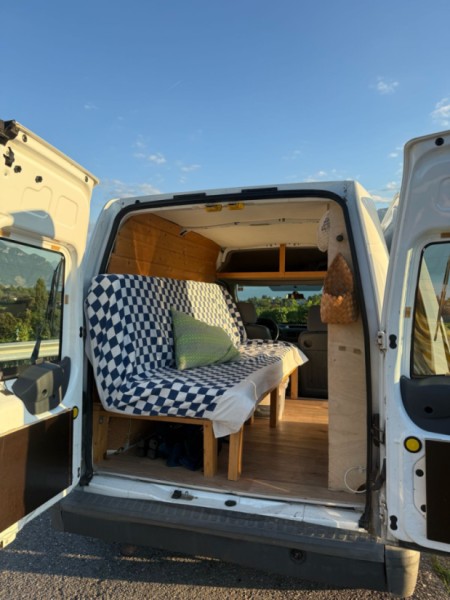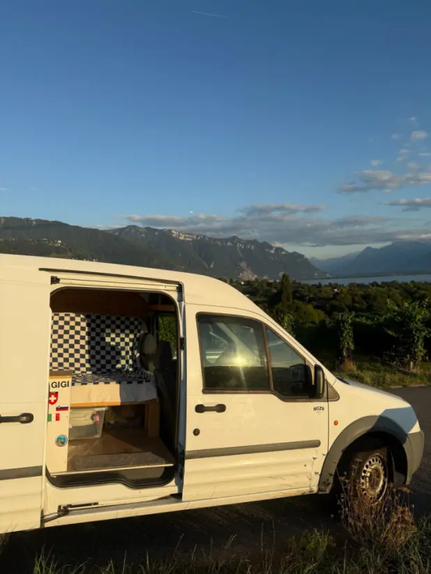 Originaltext anzeigenWir lieben unseren kleinen Van über alles, aber nach unserer sechsmonatigen Europareise fällt es uns schwer, ihn auf dem Parkplatz stehen zu sehen… deshalb möchten wir ihn gerne mit anderen Reisenden teilen! Bevor Gigi unser Abenteuerbegleiter wurde, war der Van im Baugewerbe im Einsatz. In den letzten Jahren haben wir ihn zu einem einfachen und flexiblen Wohnraum umgebaut: Dank des Klappbetts können zwei Personen bequem schlafen. Er ist perfekt für einen unkomplizierten, naturnahen Urlaub, ohne auf Komfort verzichten zu müssen. Unter dem Bett und über dem Fahrersitz befindet sich reichlich Stauraum. Gegenüber dem Schlafsofa gibt es einen Schrank für die Küchenzeile (Lebensmittel und Geschirr). Zum Kochen stellen wir einen Gaskocher und eine kleine Kühlbox zur Verfügung (die nur während der Fahrt am Zigarettenanzünder angeschlossen wird). Gigi ist sehr wendig und leicht zu fahren. Dank seiner kompakten Größe, der Abdeckungen an den hinteren Fenstern und des Vorhangs, der den vorderen Bereich abtrennt, wirkt der Van unauffällig.