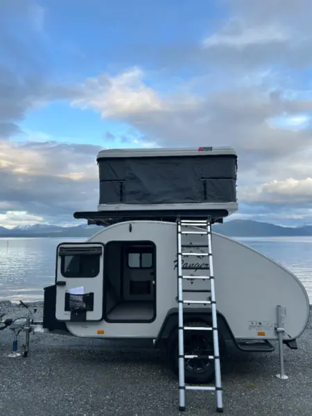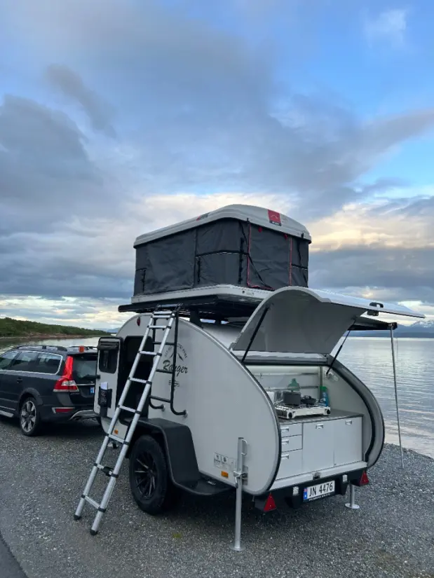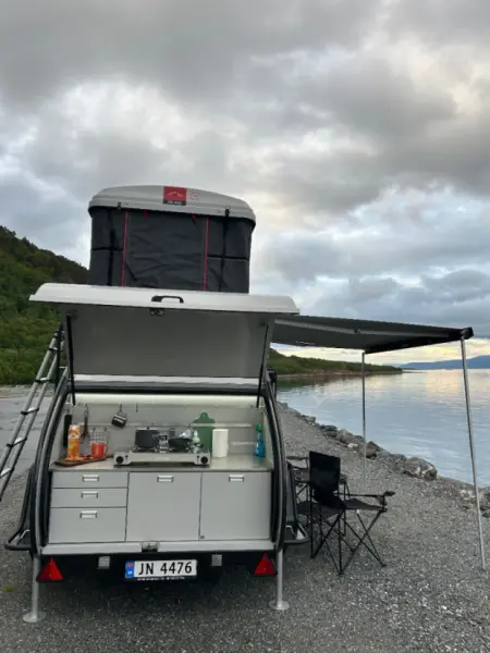 Mit Google-Übersetzer übersetzenTopp utstyrt Hero Camper Norges råeste camper til leie på Norges vakreste øy Senja! Hero Camper Ranger 2018 Med denne Hero Camperen kan du reise komfortabelt hele året. Med 24mm isolasjon og testet ned til -21 grader kan den brukes like godt sommer som vinter. En perfekt vogn utstyrt med det man trenger for et skikkelig friluftseventyr eller en rolig helg på campingplass rundt om i Nord-Norge/Sverige. Med kraftige off-road dekk og sin lette vekt kan den fint trekkes ut fra allfarvei og inn på mindre veier på fjellet eller til sjøen. Den lave vekten gjør at de aller fleste biler kan trekke Hero Camper med klasse B. Man kan enkelt bruke Vegvesenet sin tilhengerkalkulator for å se om du kan trekke den med din bil ved hjelp av Reg.nr. Inne i vogna finner du sengeplass med god plass til 2 evt. 2+1 barn (bredde: 156 cm. Lengde: 208 cm). På taket er det et telt som er utrolig lettvint å slå opp med 2 gode sengeplasser med stor madrass. Innvendig finner du også hyller for oppbevaring, skap, dekorativ LED-belysning, vanlig strømkontakt, stort appstyrt lithiumbatteri som enkelt gir strøm i flere dager + kontrollpanel hvor man enkelt styrer oppvarming med gass. Bak camperen er det et godt utstyrt kjøkken med integrert vask, 30 liter vanntank, kjøleboks og gassbluss x2. + alt av kopper og kar, primus kokesett, og utstyr for å lage mat. På den ene siden har vogna Thule markise som kan slås ut samt fortelt til både markise og kjøkkenet bak hvis man vil sitte utendørs men under tak eller hvis det regner.