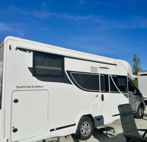 Der Benimar Tessoro 463 Special Edition ist die ideale Wahl für Paare und kleine Familien, die ein geräumiges und komfortables Wohnmobil für ihre Reisen suchen. Er bietet ausreichend Platz und Flexibilität und gibt Schlafmöglichkeiten für bis zu fünf Personen. Die Zwillingsbetten können zu einem grossen Doppelbett umgebaut werden (z. B. für 2 Erwachsene und 1 Kleinkind) und einem zusätzlichen Hubbett für zwei Personen. Highlights: -Sicherheitstür XL mit 2 Verriegelungsbolzen, Fenster mit Moskitonetz und Mülleimer, Alarmanlage inklusive -Panoramadach im Fahrerhaus mit Moskitonetz und Verdunklungssystem -Ausziehbarer Esstisch mit Eckbank, TV im Wohn/- Essbereich -Hubbett elektrisch 2 Plätze ( 140/120x191, max. 230 kg) -Küche in L–Form, 3-Flammen-Kocher mit elektrischer Zündung -Großer Kühlschrank (mit Gefrierfach) 140 Liter mit Schublade für bis zu 9 Flaschen -Trenntür zwischen Schlafzimmer und Sitzgruppe -Einzelbetten umbaubar zu großem Doppelbett (85×188 + 85×190, zusätzliche Matratze für den 5. Schlafplatz: 89×206) -Innentür mit direktem Zutritt zur Garage -Badezimmer mit separater Dusche und hinterleuchtetem Spiegel -Große Garage mit 2 Türen