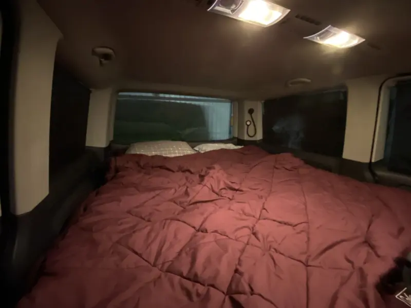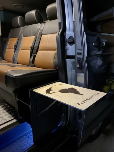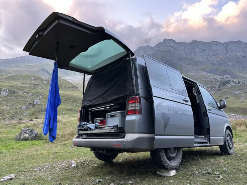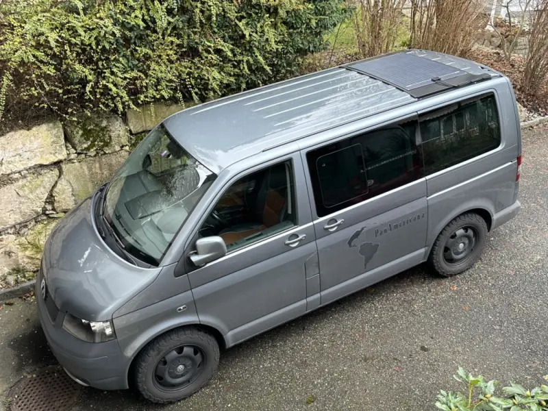 Der VW T5 PanAmericana ist ein Allradbus mit einer Differentialsperre an der Hinterachse. Auf dem Bus sind robuste AT Reifen mit Winterzulassung montiert. Er ist dank Solar und Ladebooster komplett autark. Einen Landstromanschluss hat er nicht, wird aber auch nicht benötigt. Die 100A Lithiumbatterie ist vollkommen ausreichend. Für ausreichend Wärme sorgt die verbaute Standheizung. Das Bett ist 1,40m breit und knapp 2m lang. Im Küchenmodul befindet sich eine 40l Engelkühlbox, ein Waschbecken, eine grosse Schublade und 1x20l Frischwasser- und 1x20l Abwassertank. Den Beifahrersitz kann man drehen. Die Platte vom Küchenmodul kann man ausziehen und erhält so einen Tisch. Am Frischwassertank lässt sich eine Aussendusche montieren. Bei der Vermietung sind immer zwei Fenstertaschen, Thermomatten, ein Tisch für draussen, zwei Campingstühle, ein Gaskocher, Teller, Besteck, Töpfe und Becher dabei. Man kann zusätzlich diverse Optionen dazu mieten. Unter anderem ein Busvorzelt mit einem Schlafabteil für zwei weitere Personen.