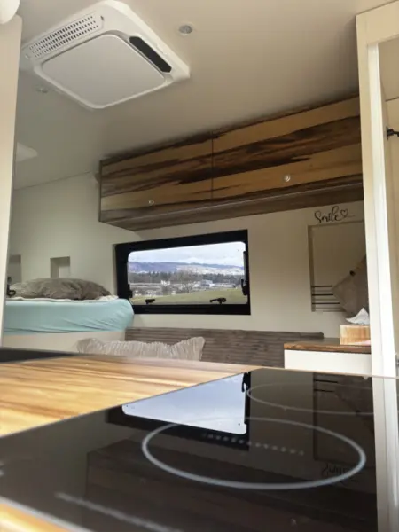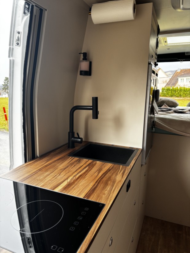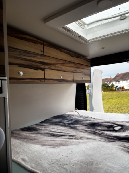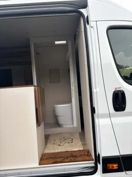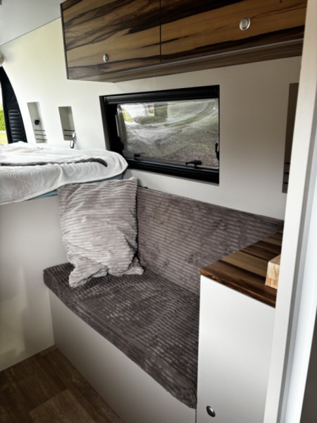 das Bett hat die Masse 1.80m x 1.60m; Federkernmatraze statt nur Schaumstoff für bequemes und komfortables Schlafen, es hat Leselampen auf beiden Seiten des Bettes. Licht ist dimmbar und es hat 3 Bereiche: Eingang und Wohnbereich, Schlafzimmer, Dusche. Die Touch-Fläche ist genau da, wo man sie braucht (kein umständliches Suchen nach dem Licht-Schalter). Der Wasserhahn kann - je nach Gebrauch - als Strahl oder als Regendusche gebraucht werden. Nebst der Innendusche hat es auch eine Heckdusche (ideal für Hund oder nach dem Baden). Grosse Heckgarage mit 90l Frischwasser und 65l Grauwasser; Ablassen ist ganz einfach mit einem Hebel bei der Fahrertür - natürlich auch mit Übersicht, wieviel gebraucht oder noch vorhanden ist.