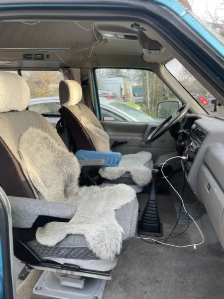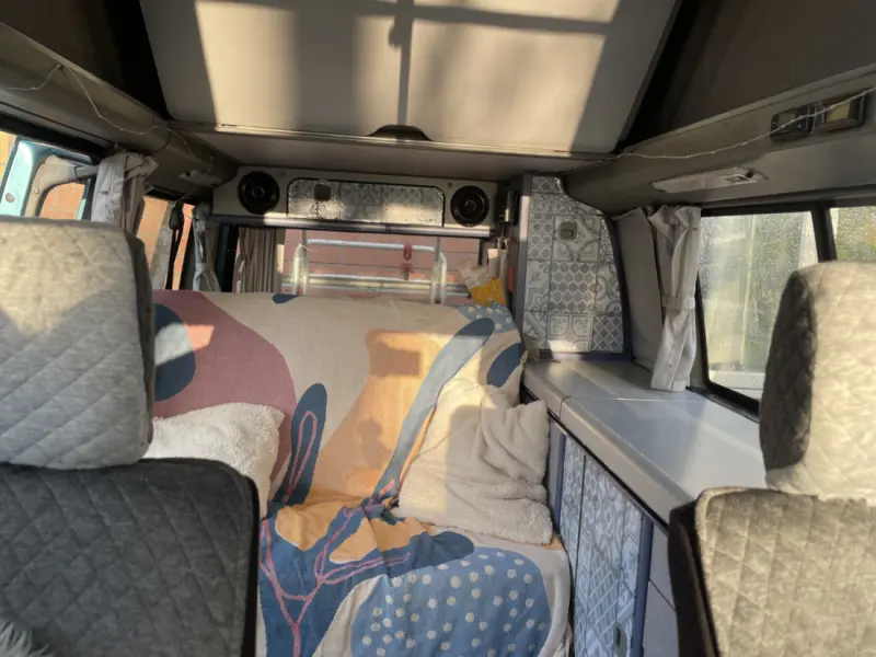 Original California Camper Ausstattung. Ihr bekommt ein Rund-Um-Sorglos Paket: Man schläft unten mit 2 Leute und oben kann theoretisch noch eine weitere Person schlafen. Das Dachzelt ist aber recht alt und es ist oben echt eng und hart. Daher ist es hier nur für 2 angegeben. Wer damit aber kein Problem hat, kann auch zu 3 im Bus schlafen, also eine zusätzliche Person oben :) Die Vordersitze können so gedreht werden, dass man mit 4 Leuten im Bus sitzen kann und ein Tisch innen kann auch eingehängt werden, falls es regnen sollte sitzt man als bequem drinnen. Dieser VW T4 verfügt über: - eine Sitzbank (2 Plätze) und Beifahrer und Fahrersitz - alle mit Gurten - aus der Rückbank kann ein Bett für 2 Personen (ca 1.2 x 1.9 Meter) - Zweitbatterie (wird während der Fahrt oder mit Solarstrom geladen) - 1 Steckdose mit 240v, welche über Zweitbatterie betrieben wird - 2 Lampen und eine Lichterkette an der Decke für die Innenbeleuchtung - Kühlschrank, welche über Zweitbatterie betrieben wird - 2-Feld Gaskocher mit Gasflasche zum draußen kochen - Spritiuskocher für drinnen, der aber für entspanntes Kochen zu schwach ist, für nen Tee reichts :) - Spüle mit Frischwasser im Auto - Küchenausstattung: Pfanne, Teller, Besteck, Gläser etc. - 60 Liter Frischwasserkanister - 40 Litet Abwasserkanister - viel Stauraum für dein Reisegepäck - Zentralverriegelung - Campingtisch und 2 Stühlen - Vorzelt - Hängematte - PV-Modul (auf dem Dach montiert, lädt die 2. Batterie, sodass auch ohne externen Strom noch nie die 2. Batterie alle war) - Es gibt 2 Decken (2x2M) und Kissen. Bezüge müssten selbst mitgebracht werden - hat keine Klimaanlage Bitte beachtet, dass es ein sehr altes Auto ist (über 30 Jahre) und von uns auch viel genutzt wird. Also es ist nicht alles perfekt, es gibt Macken, Kratzer und auch nicht mehr alles lässt sich 100 % reinigen, dafür ist es super gemütlich :)