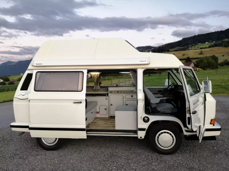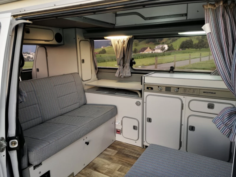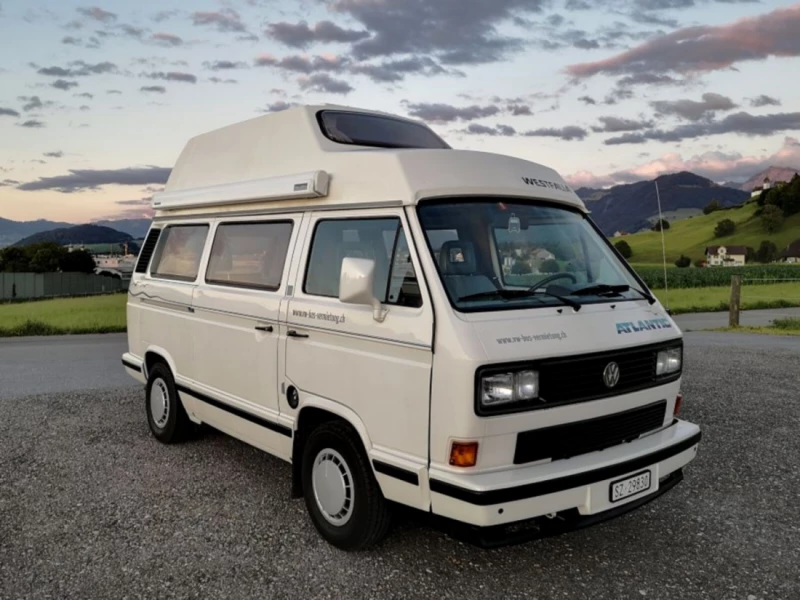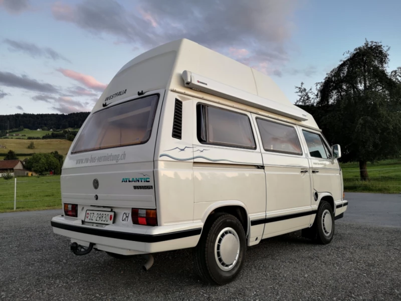 Unser VW Bus T3 Atlantic mit Aufstelldach eignet sich für Leute, welche die Flexibilität eines Fahrzeuges mit Aufstelldach und die unübertroffene Qualität eines originalen Westfalia Camping Ausbaus schätzen. - 4 Schlafplätze, davon 2 auf Kappsitzbank und 2 im geräumigen Aufstelldach - 4 Sitzplätze, vorne komfortable Pilotensitze mit Armlehnen, hinten 1x Beckengurt und 1x 3-Punkt Gurt - 95 PS Benzin Motor, 1.9 Liter WBX, 5-Gang Getriebe, 10.5 l / 100 km - Küchenzeile (Frischwasser, Spüle, Kocher, Absorber Kühlschrank 12V / 220V / Gas) - Frischwassertank, Abwassertank - Grill / Kocher - Kombi mit langem Anschlussschlauch an den Unterflur Gastank - Sonnenmarkise, Tisch, Stühle, umfangreiche Campingausstattung - Standheizung stufenlos regulierbar, läuft mit Benzin vom Treibstofftank - Vorhänge zuziehbar für alle Fenster vorne und hinten - Fahrersitz teilweise drehbar und Beifahrersitz vollständig drehbar - Viel Stauraum in den Schränken und in der Klappsitzbank - Top Musikanlage mit DAB+ Radio / CD mit MP3, USB, AUX, Bluetooth, Fernbedienung & Subwoofer - 150 Watt Stromkonverter für Kleingeräte (12V -> 220V) - sehr gepflegter Klassiker VW Bus für 2 bis max. 4 Personen - ideale Reisegeschwindigkeit 110 km/h - optional: Veloträger, Bus-Vorzelt, Navi, WC Klassische und moderne Bulli Campingbusse mit top Ausstattung sowie sportliche Kastenwagen Camper mieten sie bei der VW Bus Vermietung Philipp Gatzmann in Altendorf am oberen Zürichsee. Unser Angebot umfasst die folgenden Schwerpunkte: - Vermietung von VW T3 Bulli Klassikern Unsere top gewarteten und modernisierten T3 Bulli Klassiker in Sammlerzustand sind ideal für Mieter, welche noch einen der letzten richtigen Bullis mit Heckmotor fahren möchten, und den typischen Motorsound ebenso schätzen wie wir. - Vermietung von VW T6.1 California Ocean Unsere neuwertigen vollausgestatteten T6.1 California Ocean Campingbusse sind das Richtige für Mieter, die das Bulli Feeling etwas moderner interpretieren. - Vermietung von kompakten Campern Unsere sportlichen kompakten Kastenwagen (Hymer Free 540, Knaus BoxStar 600) sowie der teilintegrierte Knaus Tourer Van 500 MQ bieten etwas mehr Platz als die Campingbusse. - Vermietung von Campingzubehör Aus langjähriger Vermietungserfahrung und eigener Campingerfahrung können wir ihnen praktisches Zubehör zu unseren Fahrzeugen anbieten. Einige Gründe, warum sie bei uns mieten sollten: - flexibles und faires Preismodell - flexible Übergabe- und Rückgabezeiten - top gewartete VW T3 Bulli Klassiker in Sammlerzustand - vollausgestattete VW T6.1 California Ocean Campingbusse - kompakte sportliche Kastenwagen Camper - hochwertiges und erprobtes Zubehör - langjährige Camping- und Vermietungserfahrung Wir freuen uns auf ihre Mietanfrage!