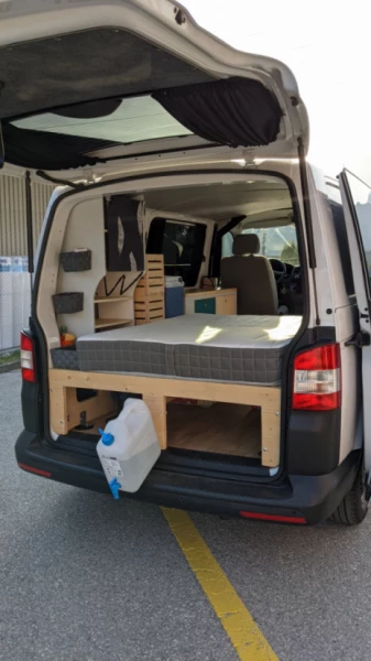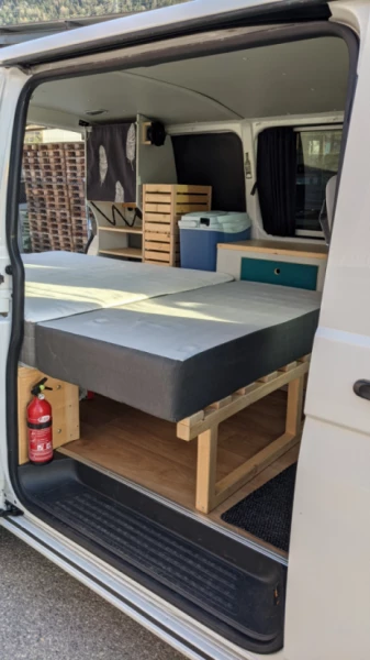 Originaltext anzeigenVW T5, leicht zu fahren, mit zwei Sitzen. 2.0 TDI, 6-Gang-Schaltgetriebe, niedriger Kraftstoffverbrauch (7–8 l/100 km). Drehbarer Beifahrersitz, Vorhänge, getönte Scheiben, einfacher tragbarer Gaskocher mit einer Flamme, FM/CD-Radio (CD/MP3). Zusatzheizung, die direkt vom Dieseltank gespeist wird. Töpfe, Pfannen, Teller, Schüsseln, Gläser, Besteck, Salz, Gewürze usw. Individueller Ausbau, abgeschlossen 2020. Schlafbereich 130 x 200 cm, Stauraum unter dem Bett. Küchenzeile und 12-Liter-Wasserkanister im Heck. Thermoelektrische Kühlbox. Campingtisch, zwei Stühle, Hängematte, Fernglas. 230-V-Campingsteckdose (CEE-17). Zweite Batterie unter dem Fahrersitz (Zusatzbatterie) mit Zigarettenanzünderbuchse für die Kühlbox und zwei USB-Anschlüssen zum Laden Ihrer Geräte. Saubere Bettwäsche, eine Decke, Geschirrtücher, Küchentücher usw. sind vorhanden. Bitte bringen Sie Ihre eigene Bettdecke und (kleine) Kissen mit. Optional steht ein Fahrradträger zur Verfügung, der für den Transport von zwei Fahrrädern mit einem Gesamtgewicht von maximal 60 kg geeignet ist. Zahlreiche Mega-Compilations ♫ von Francis Cabrel, Paul Mac Bonvin, U2, Rammstein, Michel Sardou ♡ und mehr.