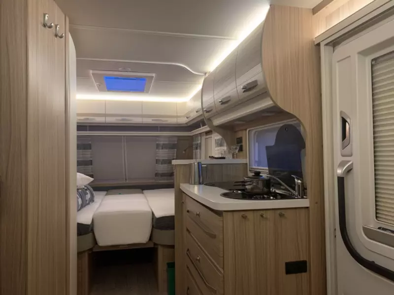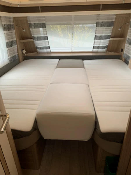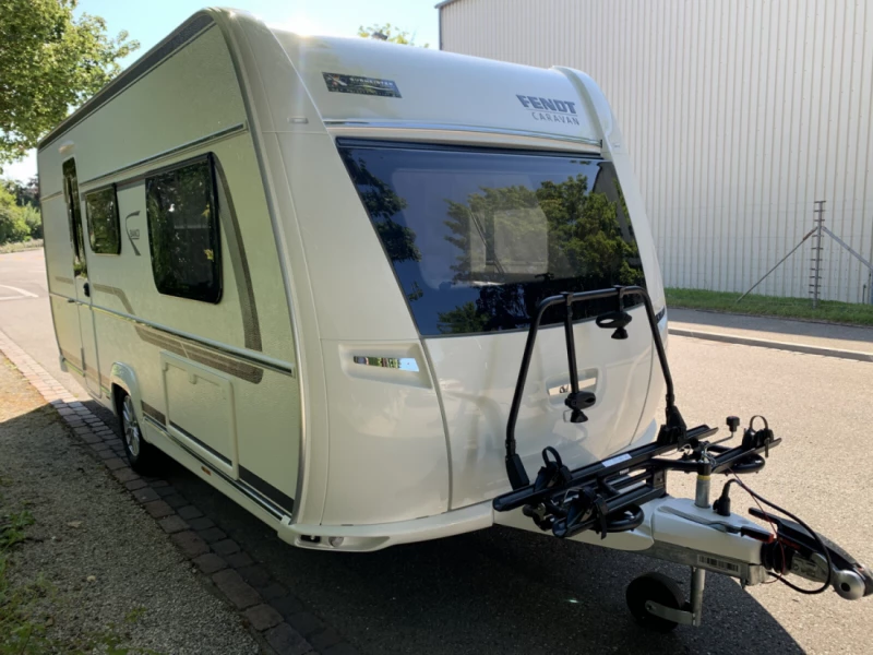 Dieser Fendt Wohnwagen ist perfekt für 2 Erwachsene / Paare oder auch Familien mit 1 Kind, die einen komfortablen, gehobenen Standard im Urlaub geniessen möchten. Er ist erst 1 Jahr alt und steht so toll da! ….und er hat Lust zu Reisen. Er besitzt vorne einen Veloträger für 2 Fahrräder (bis 30kg) und einen Mover von Truma! Da fängt der Urlaub schon beim Aufbau an, denn so kann er mit der Fernbedienung bis auf den Stellplatz gefahren werden. Außerdem kann man 444kg zuladen! Das Vorzelt ist auf Wunsch dabei und in ca. 20min schnell aufgebaut, denn der elektrische Kompressor braucht nur ein paar Minuten zum Aufblasen und so steht es in nullkommanix. Das Sonnendach (Plane an der Kederschiene eingezogen) ist außerdem immer dabei und falls es nur schönes Wetter gibt, kann man es auch einfach und schnell am Wohnwagen einziehen und vorne mittels 3 Stangen aufstellen und abspannen. Dazu gibt es natürlich einen Zeltboden, 1 komfortablen Tisch und 2 Stühle. Im Fahrzeug hinten gibt es eine L-förmige Ecksitzgruppe (auch umbaubar als Liegefläche und für 1 Kind/Person bis 1,70m perfekt), daneben einen Kleiderschrank und einen großen Kühlschrank sowie das Badezimmer mit WC, gegenüber die Küchenzeile. Der Kühlschrank ist mit einem Gefrierfach ausgerüstet und funktioniert mit Gas und 230V (sowie mit 12V beim Fahren zum Temperaturerhalt). Im vorderen Teil gibt es zwei komfortable Einzelbetten, die sich einfach zu einer riesigen Liegefläche (2,00x2,10m) verbinden lassen. Außerdem befindet sich hier auf Wunsch auch ein Fernseher, der mittels automatischer SAT-Anlage kinderleicht eingestellt werden kann. Der vordere Teil lässt sich für mehr Privatsphäre mittels einem Vorhang zum hinteren Teil, also zur Küche und Sitzecke hin, abtrennen. Das Fahrzeug hat eine, unter der Sitzecke, versteckte Gas-Heizung (Truma Combi 4), die bei Bedarf auch ca 9l Warmwasser erwärmt. Sie benötigt dafür ebenfalls Gas und einen 230V-Stromanschluss. Außerdem hat der Wohnwagen auch eine Fußbodentemperierung, welche den Boden bei niedrigen Außentemperaturen angenehm warm hält.