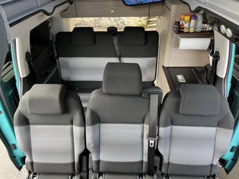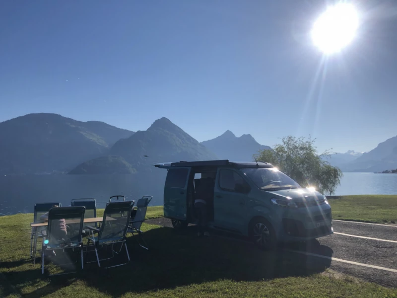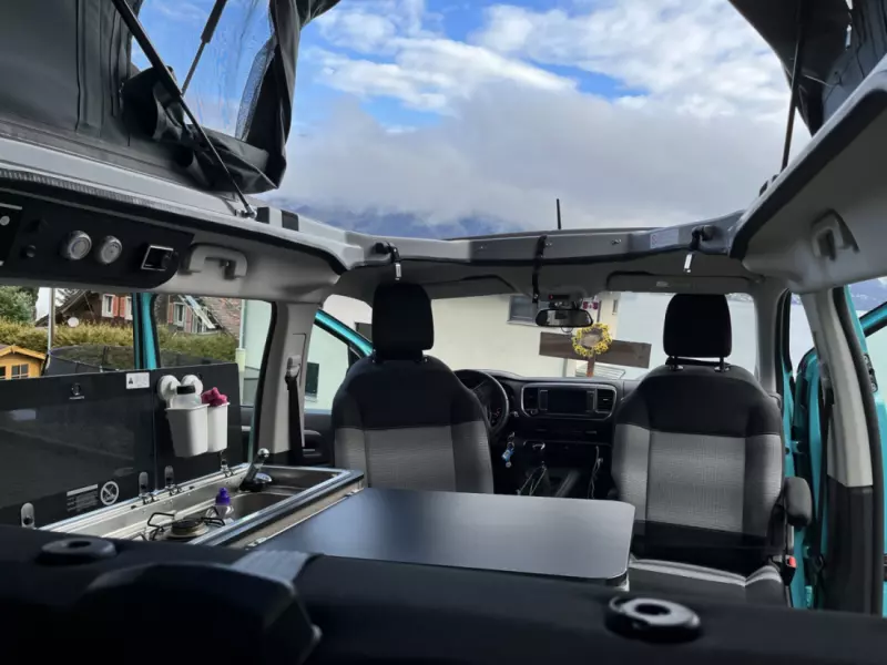 Unser treuer Campster darf nun auch euch in den Urlaub bringen. Minimalistisch, modern und Sparsam ist unser tolles „Büssli „. Im Aufstelldach findet sich ein bequemes Bett das genug Platz für zwei Erwachsene bietet. Für zweit weiter Schlafplätze legt man einfach die Sitzbank um, die mit der Bettverlängerung ebenfalls ein geräumiges Bett ergibt. Eine herausnehmbare Küchenzeile mit zwei Gasflammen zum kochen und Spühlbecken mit jeweils 10L Wasser und Grauwassertank vervollständigen unser „Büssli“ braucht man die Küche nicht kann man ein 7 Plätzer draus machen. Unser Büssli ist auch für kalte tage geeignet dank einer Diesel Standheizung ist es immer schön warm.