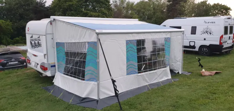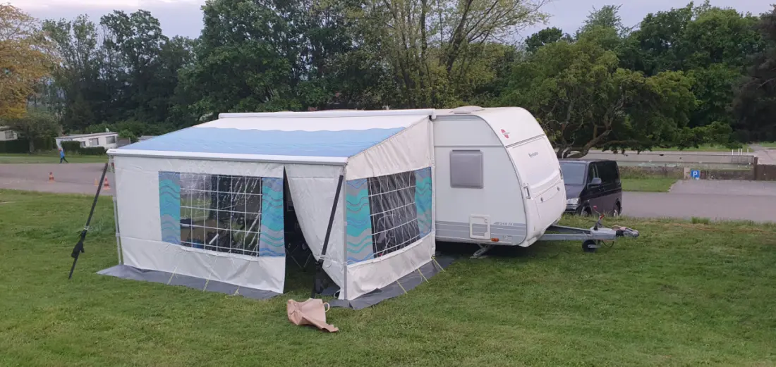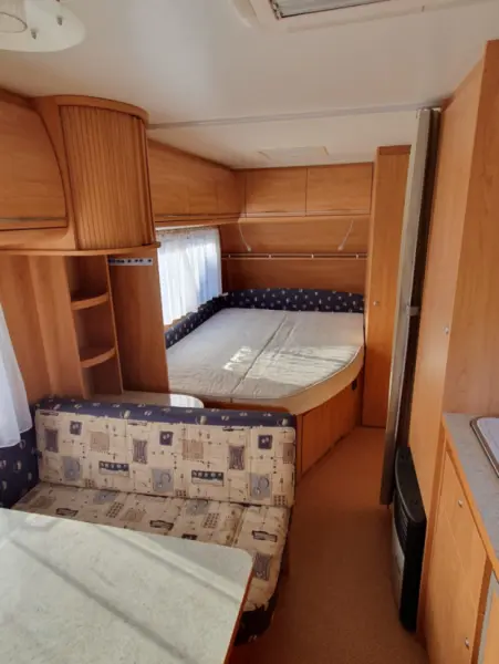 Traduire avec Google TranslateWohnwagen mit Doppelbett und Kajütenbett ( oberes Kajütenbett Max 65Kg). In der Mitte eine Sitzgruppe mit Tisch welche zu einem Bett umfunktioniert werden kann. Der Wohnwagen ist mit Pfannen und Geschirr für 4 Personen ausgestattet. Kühlschrank, Gaskocher, Gasheizung und Toilette runden den Inneraum ab. Am Wohnwagen angebaut ist eine Kassettenmarkise, mit den Front und Seitenwänden erhält man so ein geräumiges Vorzelt. (4.5mx2.75m) Es hat 1 tisch und 4 campingstühle Und 1 Campingstuhl für Kinder bis ca 4 Jahre Fürs Kochen hat es ein seperaten Gaskocher welcher auf dem kleineren Tisch aufgestellt werden kann. Ein Kleiner Gasgrill ist mit dabei. ACHTUNG: Mit dem inventar im wohnwagen sind noch 70Kg zuladung im Wohnwagen möglich. Bei fragen stehe ich jederzeit zur verfügung.