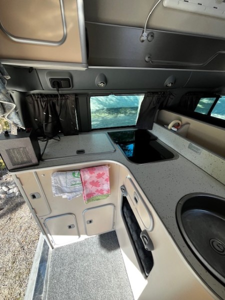 Traduire avec Google TranslatePortapotta, ulkosuihku, vesihana (kylmä vesi), pesuallas ja raitisvesisäiliö, sähköllä toimiva induktiotaso, french press kahvia varten, varsi-imuri ja siivousvälineitä, keittiön perusvarustelu (mm. leikkuulauta ja -veitsi, aterimet, lautaset, mukit, paistinpannu, pari kippoa ja kattilaa). Lähtökohtaisesti vuokraaja ottaa reissuun mukaan omat tyynyt, peitot ja liinavaatteet. Huom. Tyynyt ja peitot vuokrattavissa lisämaksusta. Valitse lisävarusteista kohta nimeltä "Lumiketjut", jos haluat peitot ja tyynyt ja ilmoita viestillä, kuinka monelle henkilölle ne haluat (max 4 hlölle). Lemmikkien omistajat huom.! Myös EcoFlow3 -siirrettävä ilmastointilaite asuintilaan saatavilla lisämaksusta. Ilmastointilaitteelle ei ollut mycamper-järjestelmässä oikealla nimellä lisävarustevalintaa, joten jos haluat varata matkallesi mukaan Ecoflow'n, valitse lisävaruste nimeltä "Kylmälaatikko". Huom. Ecoflow akkuineen vie melko suuren osan lattiapinta-alasta ja paras paikka sille on kuskin penkin takana (jää pöydän alle, kun pöytä on esillä). Ecoflow'n akun kesto on jopa 8h, eli täydellä akulla lemmikin voi huoletta jättää autoon muutamaksi tuntia.