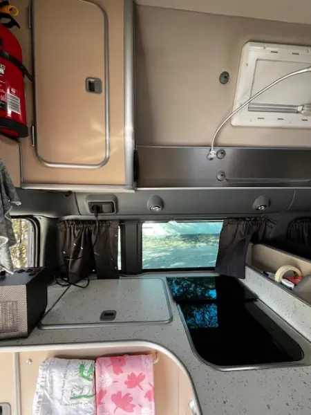 Voir le texte originalLe lit supérieur est facile à déplier : il suffit de détacher les crochets de fixation et de tirer le lit depuis le panneau avant. Une fois déplié, le lit supérieur est spacieux. Il peut accueillir, par exemple, trois enfants dans un lit simple. Attention : il n’y a pas de rebord ni de barrière de sécurité. Le lit supérieur offre un confort optimal pour deux adultes. Le canapé situé en dessous permet d’allonger le lit pour deux personnes. Le véhicule est équipé d’une prise de quai et de panneaux solaires. L’alimentation électrique et le chauffage (le réservoir de diesel doit être rempli à plus de la moitié, sinon le chauffage ne démarrera pas) sont largement suffisants pour une nuit en pleine nature. Le réfrigérateur/congélateur fonctionne sur batterie ; seule la cuisinière à gaz fonctionne au gaz. Un petit chauffage d’appoint électrique, efficace, est fourni de série. Un climatiseur portable Ecoflow, également alimenté par batterie, peut être loué pour le voyage moyennant un supplément. Attention : le climatiseur est assez encombrant. Le véhicule est équipé d’une bouteille de gaz de taille spécifique (européenne). L’utilisation du gaz est donc possible uniquement avec un supplément de 50 € par location. L'utilisation du gaz est soumise à réservation préalable (merci de m'envoyer un message après votre réservation). Le paiement de la bouteille de gaz est dû lors de la prise en charge du véhicule. Remarque : le gaz n'est peut-être pas nécessaire, car la voiture est également équipée d'une plaque à induction électrique.