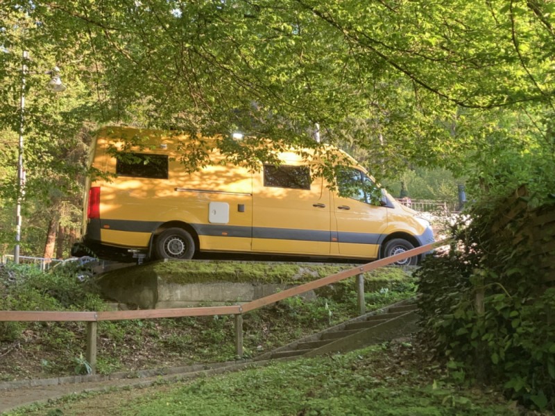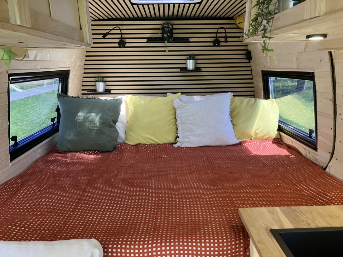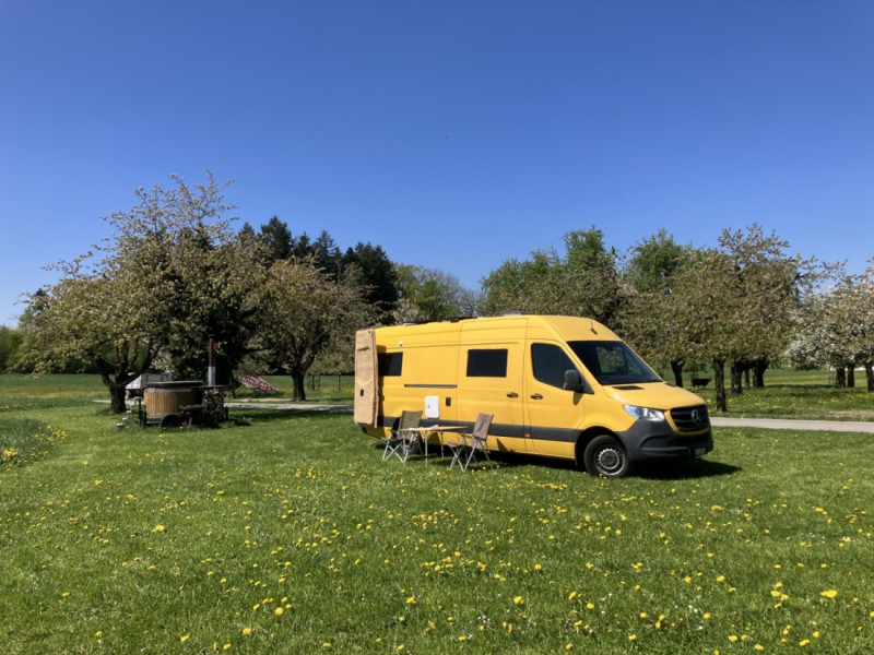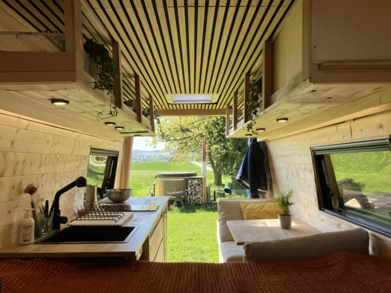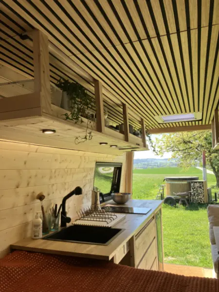 Voir le texte originalLe grand lit est exceptionnellement situé à l'avant du véhicule, et non à l'arrière. Cette configuration, associée à la cuisine et au coin repas spacieux, crée une atmosphère harmonieuse et confortable. On se croirait presque dans un studio mobile. Les repas peuvent être préparés à l'intérieur sur la plaque à induction ou à l'extérieur au gaz, selon la météo ou vos envies. La hotte aspirante assure une bonne ventilation en cas de besoin. Le réfrigérateur s'ouvre aussi bien de l'extérieur (à droite) que de l'intérieur (à gauche). Une bière est facilement accessible à la table du coin repas ou à la table du jardin. La table et les chaises de jardin sont particulièrement faciles et rapides à monter, et elles sont en plus très esthétiques. Le pare-soleil peut être fixé à différents endroits autour du véhicule grâce à trois supports magnétiques, en fonction de l'heure et de la position du soleil. Ainsi, vous trouverez toujours un coin d'ombre pour vous détendre. Il en va de même pour la poubelle, qui peut être fixée magnétiquement n'importe où à l'extérieur. Quant aux autres déchets, ils vont dans les toilettes sèches : faites ce que vous avez à faire, fermez le couvercle, allumez le robinet, puis sélectionnez Grand, Moyen ou Petit… sans blague ! L'emballage scellé du tiroir est ensuite jeté temporairement dans la poubelle magnétique. Par temps chaud, une douche extérieure avec eau chaude est disponible près de la porte arrière ! Pour ceux qui doivent absolument travailler pendant leurs vacances, plusieurs ports USB et prises 220 V sont à disposition. Grâce à la prise extérieure et aux panneaux solaires, l'électricité ne manque jamais. Seul le robinet peut être à court d'eau :-)