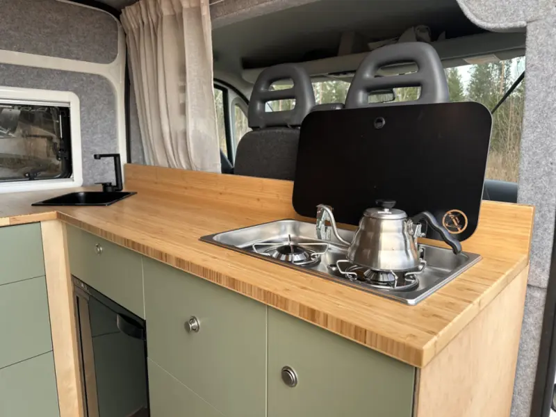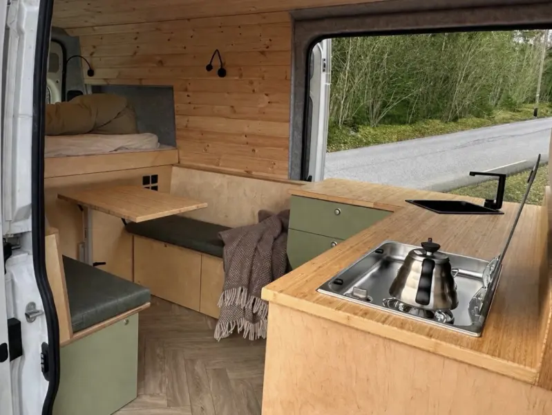 Voir le texte originalCamping-car exclusif, aménagé avec soin par des professionnels, pour ceux qui souhaitent voyager en toute liberté, confort et style. Savourez votre café du matin face à la mer et aux montagnes, dormez sous le puits de lumière et préparez-vous pour de nouvelles aventures. Le lit de 170 x 200 cm est idéal pour deux personnes. Cuisine équipée de deux feux à gaz, réservoirs d'eau chaude et d'eaux usées, table et chaises de jardin, nombreux rangements dans les tiroirs, les placards et le garage sous le lit. La batterie se recharge en roulant ou grâce à des panneaux solaires et fournit 1000 W sur la prise secteur. Possibilité de branchement à quai, mais rarement nécessaire.
