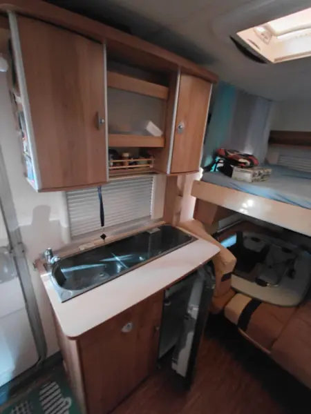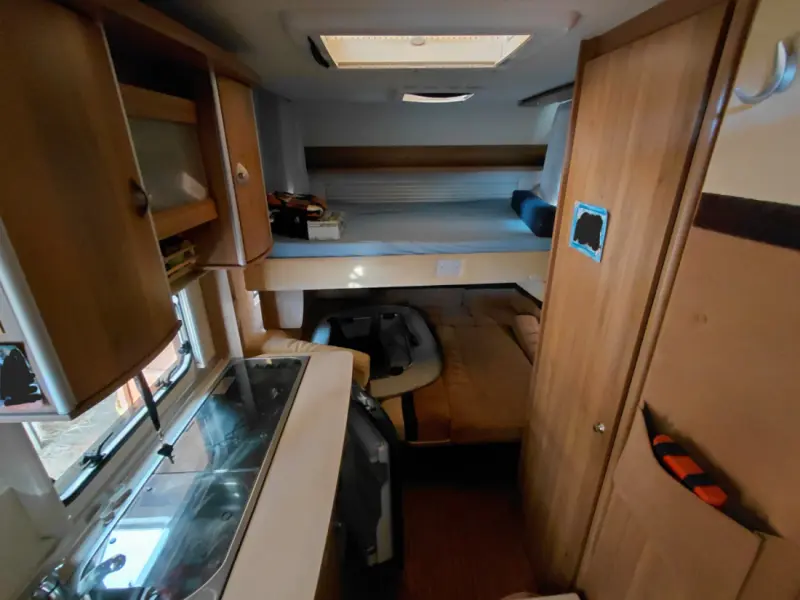 Voir le texte originalChauffage (gaz) Climatisation (électrique réversible) Toilettes Cuisine équipée d'un brûleur à gaz 3 feux. Réfrigérateur (électrique/câble) Lit superposé à l'avant (lit inférieur de 90 cm, lit supérieur arrondi de 80 cm) Canapé-lit escamotable à 140 cm au-dessus du coin repas 3 porte-vélos Petit garage (lorsque le lit inférieur est replié)