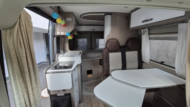Voir le texte originalLe Pössl compact est un camping-car de 541 cm de long 🚐 Idéal pour les couples ou les campeurs débutants ! Camping-car maniable avec lit double, cuisine, douche/WC et coin salon. Se conduit presque comme une voiture et se gare facilement. Parfait pour les road trips et les aventures improvisées.