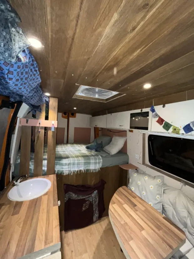 Lit confortable pour 2 personnes Table intérieure amovible pour manger ou travailler Rangement optimisé pour bagages et équipements Rideaux et occultation pour plus d’intimité Éclairage LED intérieur Multiprises USB & 220V pour recharger vos appareils Cuisine extérieure équipée avec réchaud gaz Eau courante à bord Vaisselle complète : assiettes, couverts, verres, poêles et casseroles Réservoir eau propre + réservoir eaux usées Porte-vélos pour 4 vélos Table et chaises extérieures pour repas en plein air Auvent extérieur Eclairage d’ambiance extérieur Jerrican d’essence en réserve Batterie auxiliaire et prises 12V / USB Extincteur Idéal pour Roadtrips, escapades nature ou week-end à deux Cyclistes, amoureux de la montagne ou activités outdoor Van autonome, prêt à partir et facile à conduire