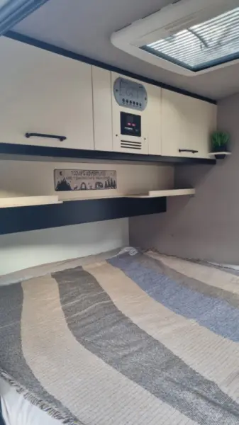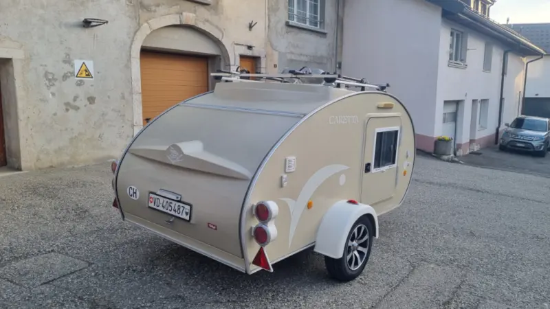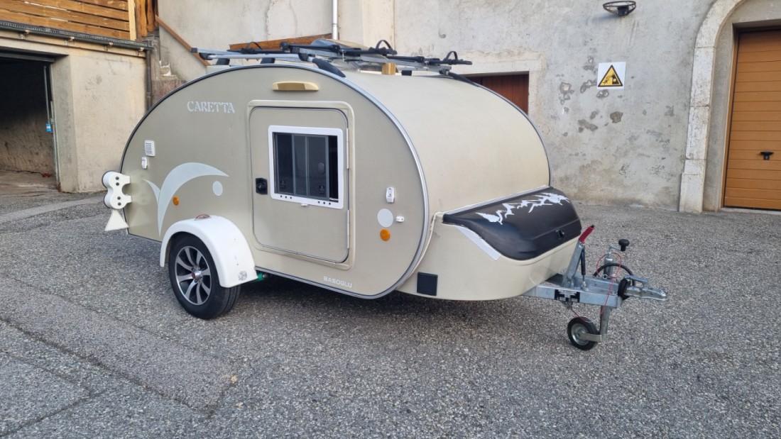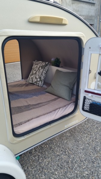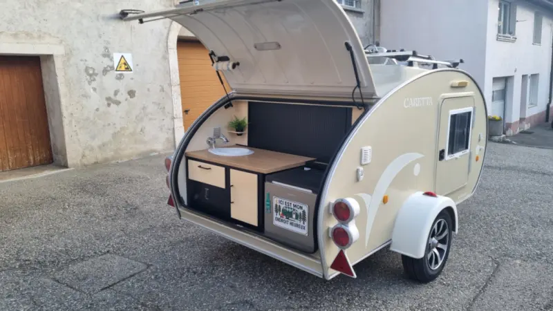 Mini caravane pour 2 personnes ( lit 147 x 200 ) Il y a un panneau solaire pour avoir plus d'autonomie mais il y a que du 12Volt au prise. Louée avec son équipement : Glacière à compression Dometic (fonctionne au gaz ou a l'électricité) - 2 Réchauds à gaz (2 bonbonnes de gaz inclus) - Casseroles - Vaisselle - Cafetière italienne. IMPORTANT : - Pas de lavage aux rouleaux - Pas besoin du permis remorque car moins de 750 Kg - Flexibilité sur les horaires de réservation