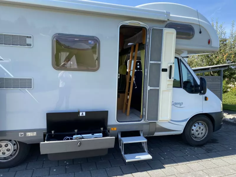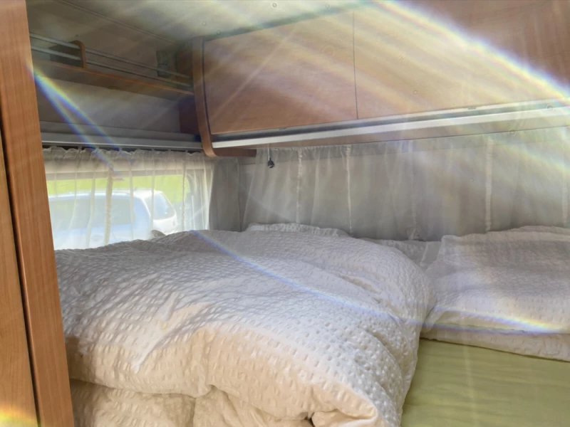 Voir le texte originalLe camping-car est entièrement équipé pour une famille de cinq personnes avec enfants. Il dispose de cinq ceintures de sécurité homologuées à trois points. Les sièges ont été récemment refaits à neuf. La radio DAB+ avec lecteur CD et la caméra de recul sont des équipements pratiques. La cabine du conducteur est climatisée. Le grand garage offre un espace de rangement généreux. Un étendoir à linge (semblable à un petit étendoir rotatif) est pratique pour faire sécher le linge. Un petit four électrique portable et/ou un petit barbecue à gaz peuvent être loués en option. À l'arrière, le lit double est un modèle Hüsler Nest récent, offrant un excellent confort de couchage. Un porte-vélos neuf pour trois vélos est également installé – les vélos électriques sont autorisés, avec une limite de poids de deux.