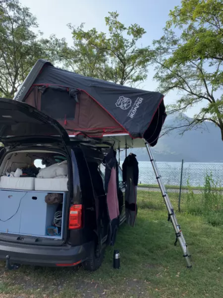 Nous louons notre tente de toit pendant les vacances d'été (du 9 juillet au 22 août). La location est de préférence d'une durée minimale de 2 à 3 semaines. Le matériel de fixation pour les barres de toit est fourni. Le véhicule doit avoir une capacité de charge minimale de 100 kg sur le toit.