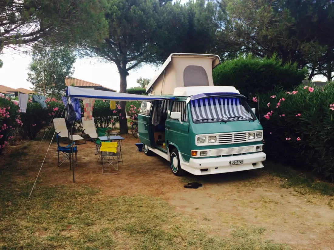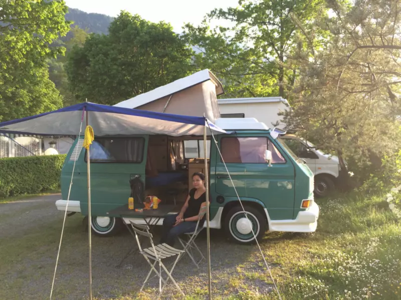 Voir le texte originalNotre camping-car VW T3 est un véritable bijou. Un classique culte par excellence, votre fidèle compagnon pour vos prochaines aventures en camping. Avec son moteur essence 1,9 litre et son refroidissement par eau, il ne vous laissera jamais tomber. Passer des vacances à son bord est une expérience inoubliable. Spacieux et confortable, il est aussi assez compact pour explorer une ville. Le van est entièrement équipé pour quatre personnes. Il dispose de quatre sièges confortables, dont des sièges avant pivotants. Les sièges avant sont équipés de ceintures de sécurité trois points, les sièges arrière de ceintures ventrales, et un siège est équipé d'un système Isofix. Deux réchauds à gaz vous invitent à cuisiner, et un barbecue à gaz supplémentaire offre une surface de cuisson extérieure. Le réfrigérateur est suffisamment grand pour stocker vos provisions et garder votre bière à la température idéale. Un auvent vous protège du soleil et de la pluie et agrandit l'espace de vie. Pour dormir, un lit double se transforme à partir des sièges arrière, et un second lit double est disponible dans la tente de toit relevable. Le porte-vélos peut accueillir deux vélos, et à l'intérieur, de nombreux compartiments et un coffre spacieux offrent un volume de rangement généreux. Une petite remorque peut être louée en option. Nous sommes ravis de partager notre camping-car avec d'autres voyageurs, et quiconque rêve d'un voyage à bord d'un combi VW vintage vivra une expérience vraiment unique. Une fois les bagages rangés, la musique choisie et le moteur en marche, l'esprit des vacances s'installe, car le voyage lui-même est une destination en soi. Lunettes de soleil sur le nez, et que l'aventure commence !